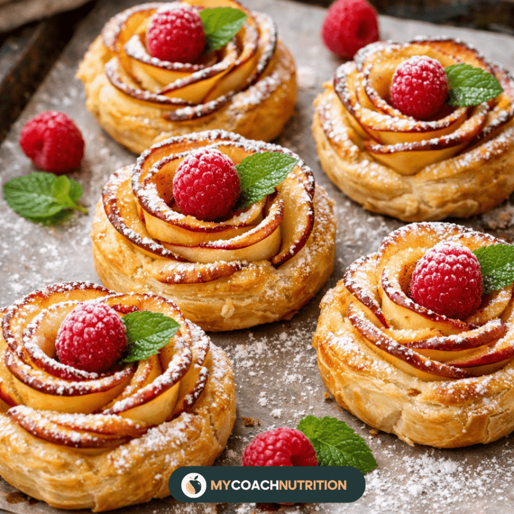 Ces petites couronnes feuilletées aux pommes sont parfaites pour les fêtes de fin d’année : rapides à réaliser, légères, naturellement sucrées et super esthétiques. Garnies de tranches de pommes fondantes, de framboises fraîches et de feuilles de menthe, elles rappellent les couronnes de Noël. Une idée originale pour un dessert healthy et chic sans prise de tête !
